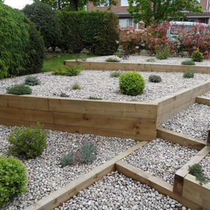 "The front garden was on a slope from the pavement down to the house, it was bland and difficult to maintain. We had no idea how we could change this patch into a garden to be proud of. We had a landscaper in to tier the garden in to 3 terraces, using railway sleepers to act as retaining walls to make a feature, so we had this done and used 20/30mm scotch cobbles as the hard landscaping.